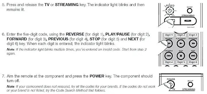 Press and release the device key that corresponds to the equipment you want the remote to operate (tv, vcr/dvd or dbs/cable etc.).